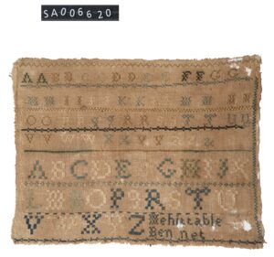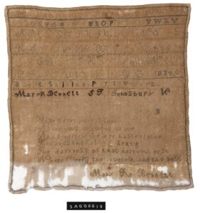 Mary and Mehitable Bennett created these samplers during the early nineteenth century. (Mary stitched her sampler in 1834, while Mehitable’s bears no date.) Used as a teaching tool, completing a sampler was a typical part of a girl’s education at the time. Samplers provided girls with an opportunity to practice their embroidery and to show their mastery of numbers and letters. In some cases the samplers included a proverb, a bible verse or saying to reinforce values and encourage culturally appropriate behavior. The samplers also served as an expression of creativity. Domestic or pastoral scenes and decorative flourishes graced many samplers.